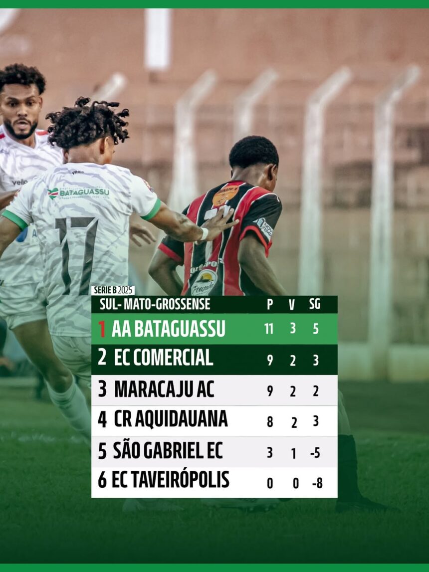 O Bataguassu conquistou uma vitória de virada por 2 a 1 sobre o Taveirópolis, neste sábado (27), no Estádio Jacques da Luz, em Campo Grande, e assumiu a liderança isolada da Série B do Campeonato Estadual de Futebol. O resultado levou o Bataguassu aos 11 pontos, deixando o Taveira ainda sem pontuar e na última colocação.
