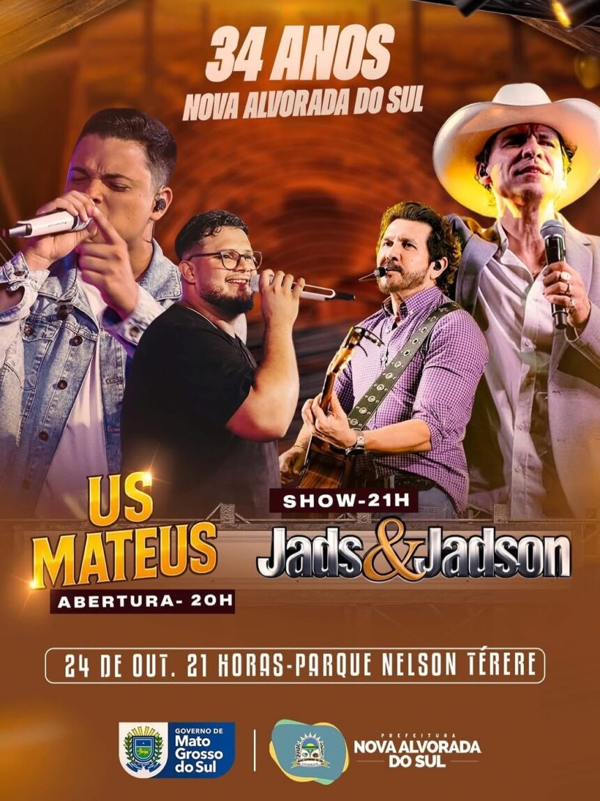 A cidade de Nova Alvorada do Sul se prepara para uma noite de emoções e homenagens. Nesta sexta-feira (24), o Parque Nelson Tereré será o palco das comemorações pelos 34 anos de história do município, começando às 20h com o show da dupla Us Mateus — artistas locais que representam com orgulho o talento e a alegria da população sul-nova-alvoradense.