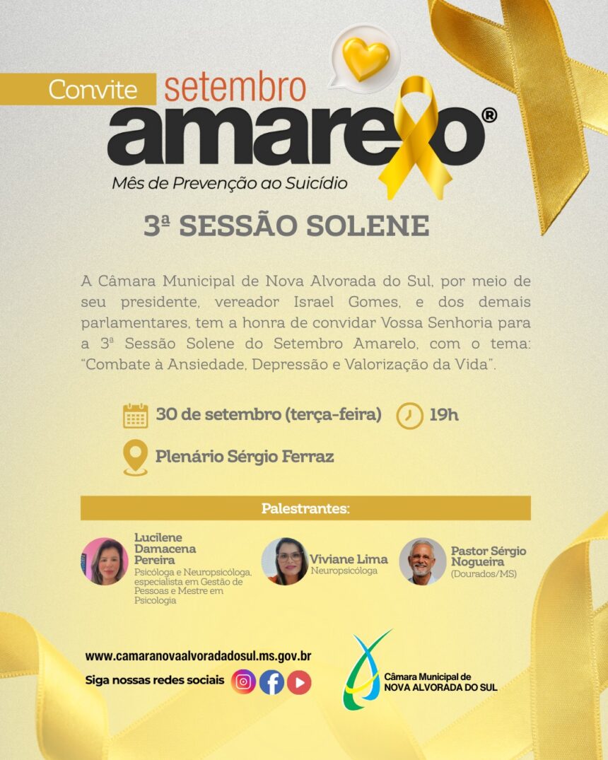 O presidente da Câmara Municipal, Israel Gomes, e a vereadora Rozidália Reis, juntamente com os demais vereadores que subscrevem a iniciativa, têm a honra de convidar toda a população de Nova Alvorada do Sul para participar da 3ª Sessão Solene com o tema: “Ansiedade, Depressão e Valorização da Vida”.